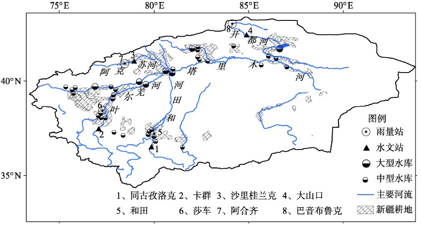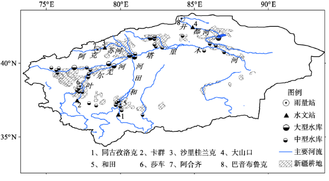 Fig. 1 Location of hydrological stations, water reservoirs and irrigation areas in Tarim river basin图1 塔里木河流域水文站点、主要水库以及灌区地理位置示意图 |