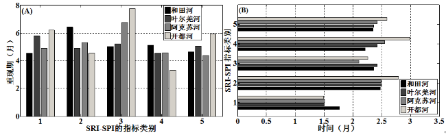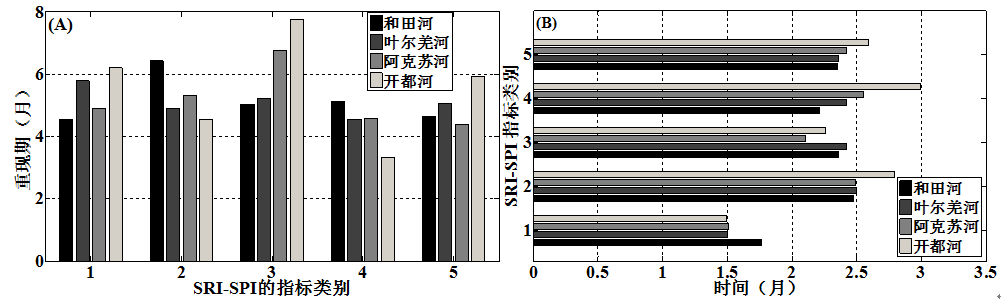 Fig. 5 The return period and the expected residence time of a given SRI-SPI class developed for individual locations in Tarim river basin图5 塔河流域各站点SRI-SPI分级的重现期(A)和期望停留时间(B) |