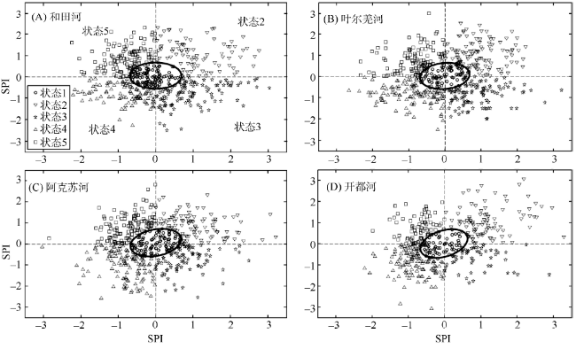 | 状态5 | 气象湿润、水文干旱 | SPI>0.5 | SRI<-0.5 | D≥0.5 |