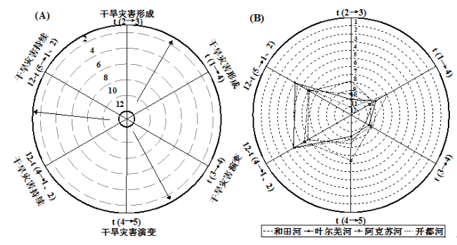 Fig. 6 The interpretation of the developed first passage of times in terms of hazard of drought for mation, evolution and persistence and drought hazard developed in Tarim river basin图6 塔河流域各站点平均首达时间演绎干旱灾害形成、演化和持续性 |