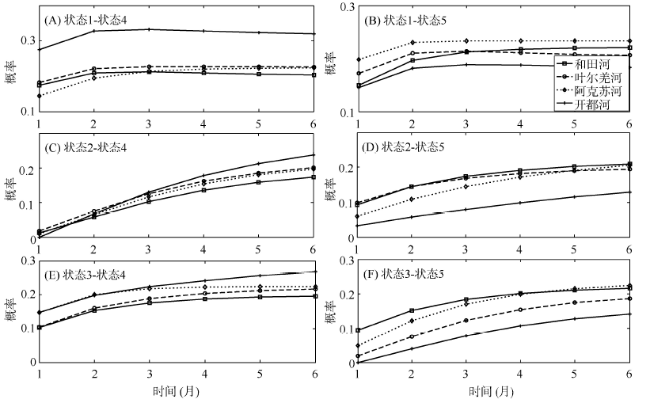 在气象干旱SPI和水文干旱SRI的二维变量干旱状态的研究基础上,通过一阶马尔科夫链模型对二维变量干旱状态进行频率、重现期和历时分析,并预测未来非水文干旱到水文干旱的概率,研究结果表明:(1)开都河、和田河在干旱形成中危害大,阿克苏河在干旱演变中危害大,开都河和叶尔羌河在干旱持续中危害大。开都河和叶尔羌河主要以气象水文干旱为主,和田河和阿克苏河以水文干旱为主。(2)开都河连续湿润或者干旱的概率最大,状态2与状态4、状态5的相互转移概率低,和田河和开都河状态4不能一步转移到状态2。(3)在长期干旱预测中,塔河流域从状态2达到状态4或者状态5的概率最低,开都河(或和田河)从非水文干旱状态到状态4的概率最大(或最小),从非水文干旱状态到状态5的概率最小(或最大)。