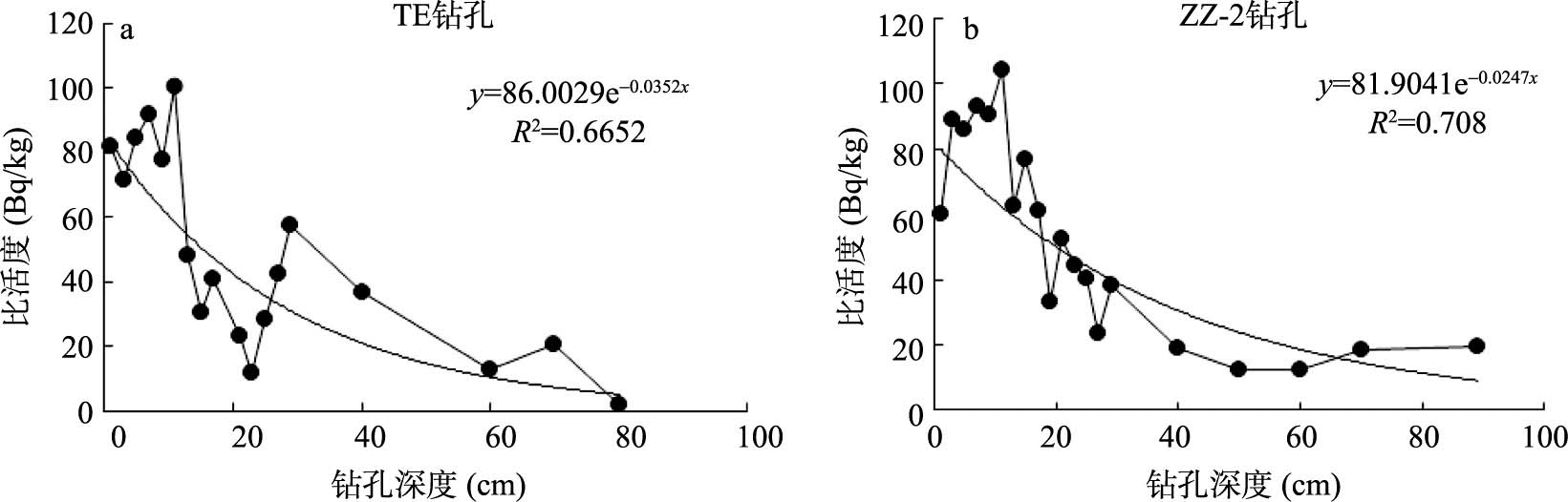 Fig. 2 Depth distribution of 210Pbex specific activity in core TE and ZZ-2图2 TE孔和ZZ-2孔 210Pbex比活度与深度关系图 |