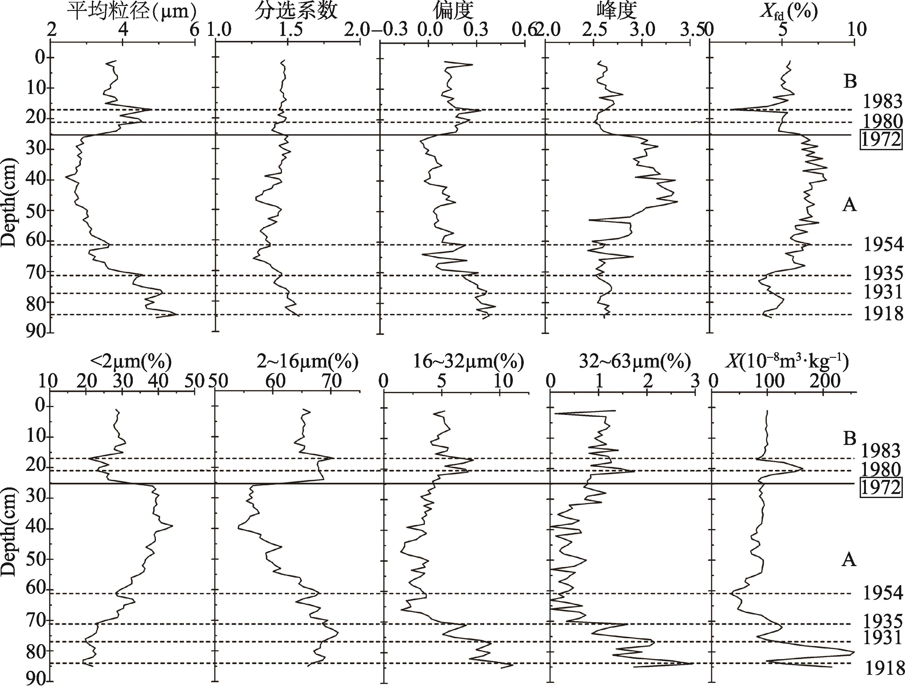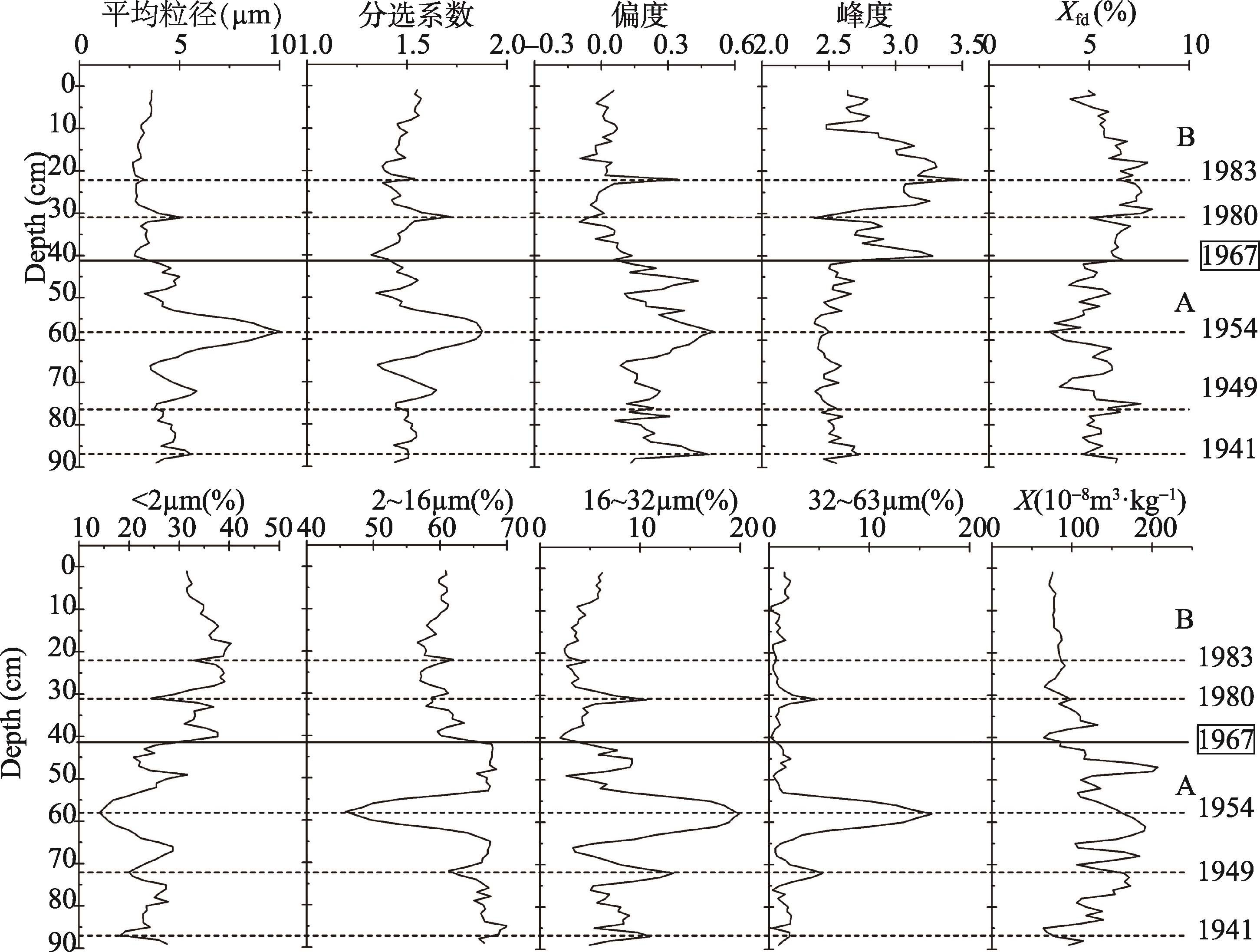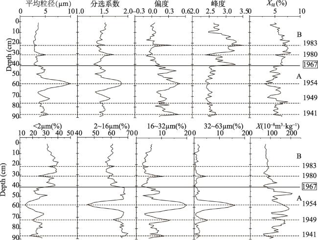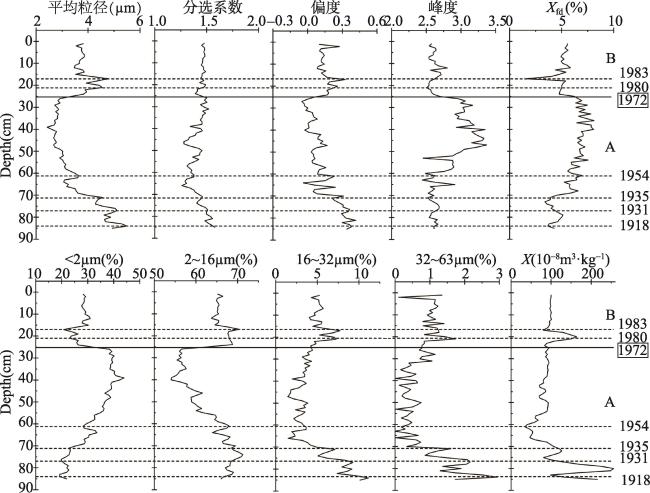 Fig. 4 Grain size and magnetic parameters with increasing depth of sediment in core ZZ-2图4 ZZ-2钻孔沉积物粒度参数与磁性参数曲线图 |