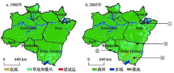 Fig. 2 Land use map of the research area in 1980 and 2005图2 1980年和2005年土地利用类型及森林砍伐严重区域位置示意图 |