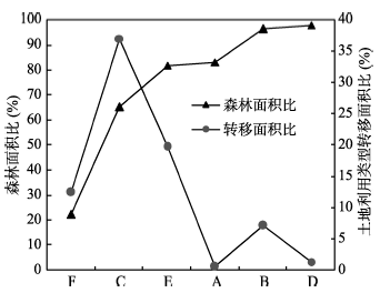 Fig. 8 Curve chart of forest area ratio and transfer area ratio图8 森林面积比和转移面积比曲线图 |