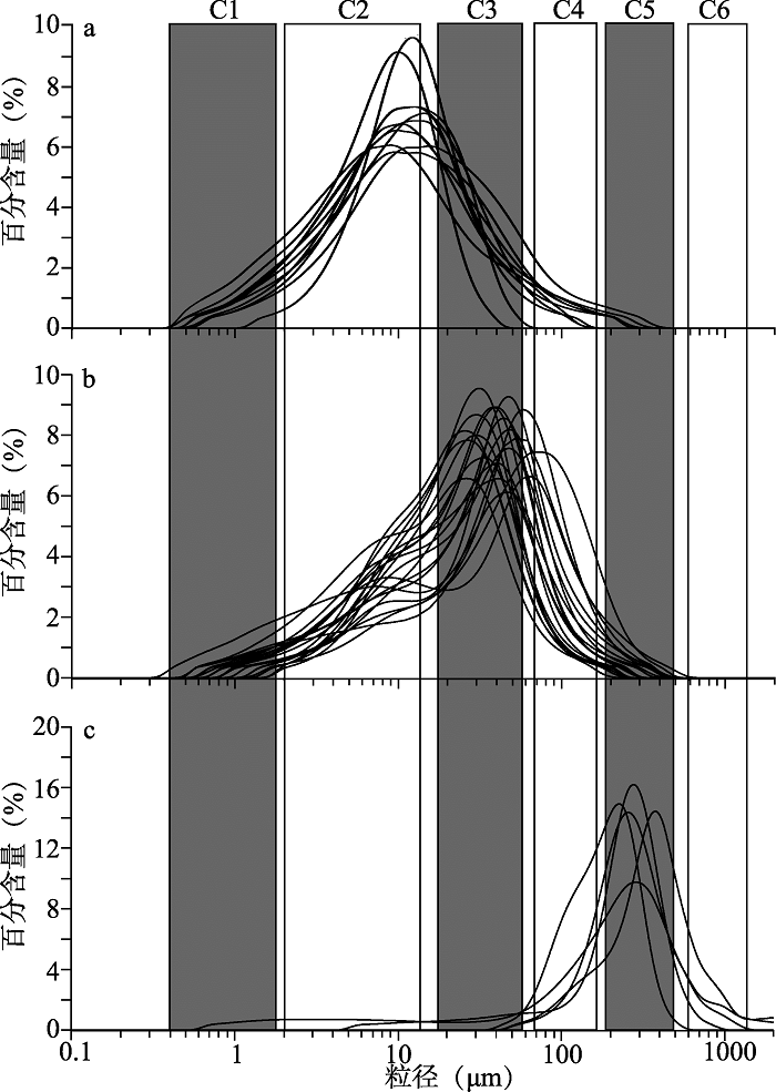 Fig. 3 The distribution of grain-size components from different parts of lake sediments (a. near lake center area, b. transitional area, c. near littoral area)图3 湖泊不同区域表层沉积物粒度组分分布特征(a.近湖心区域,b.湖心湖滨过渡带,c.近湖滨区域) |