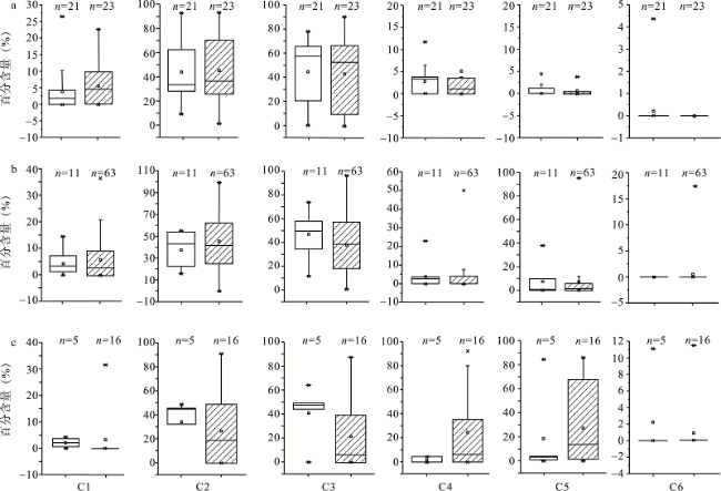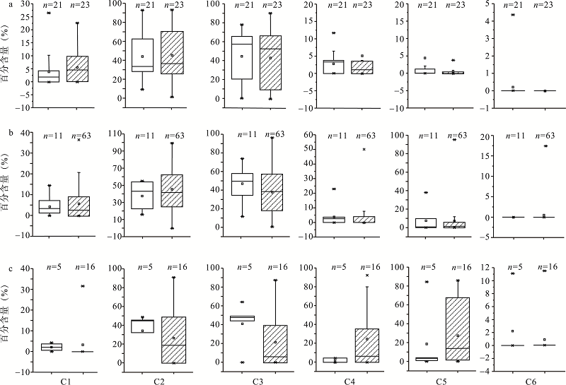 Fig. 6 Comparisons of box plots of lake surface sediments grain-size components percentages of different lake types (with or without inflow river) (a. near lake center area, b. transitional area, c. near littoral area; The blank box plots represent the lake without inflow river, the filling box plots represent the lake with inflow river)图6 不同类型湖泊(有、无入湖河流)不同区域各组分含量箱线图(a.近湖心区域,b为湖心湖滨过渡带,c为近湖滨区域;图中空白箱线图为无入湖河流的湖泊,填充箱线图为有入湖河流的湖泊) |