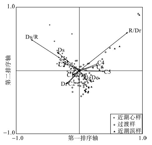 Fig. 5 Redundancy analysis (RDA) of percentage of grain-size components and influencing factors图5 湖泊表层沉积物粒度组分百分含量与影响因子冗余分析(RDA)图 |