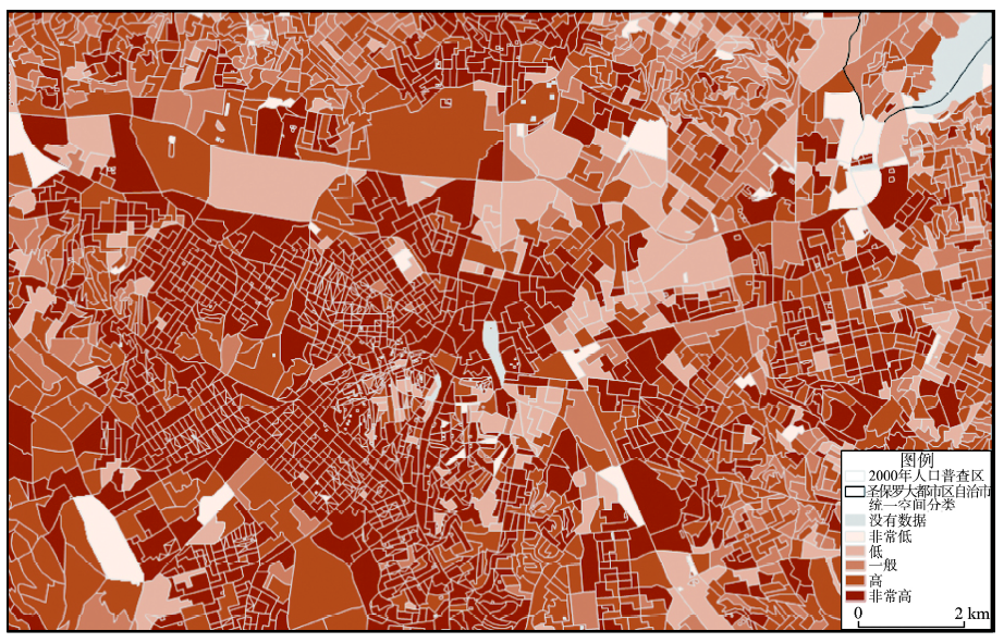 空间数据和地理信息系统在城市规划和决策中应用的重要性日见凸显。主要原因在于:重要的人口数据和社会变动经常表现出一定的空间特性,这种特性可以通过空间分析和统计方法被认识和解释。应用多元分析的空间分类方法编制圣保罗大都市区社会分异地图并进行相关分析。研究的主要数据来自2000年巴西全国人口普查,其中包括了圣保罗大都市的所有行政区和39个自治市的21774个人口普查区。为了把都市连绵区从数据全集中分离出来,我们采用混合技术进行互补分析,即在2000年4月30日的陆地卫星7号图像中绘制一个个多边形,这些被识别出来的多边形就是人口普查区。然后,通过目视解译出假彩色多边形集合。应用空间分类评分程序将这些多边形分成五类,并建立人口普查区的数目、覆盖的面积和都市连绵区之间的关系。这种多元分析方法是基于变量的均衡化来生成易于用分级统计图描述平均值,以促进可视化和后续的空间分布分析。基于多元分析的空间分类方法研究,清楚地展现了圣保罗大都市最重要的社会特征,也说明城市社会地图方法和多元分析的空间分类方法在大都市区的管理、公共政策规划和复杂决策中具有重要的应用价值。