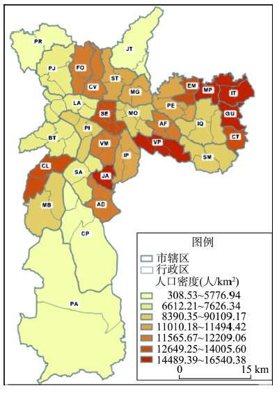 Fig. 2 Map showing the population density in the municipality of São Paulo in 2000图2 2000年圣保罗市行政区和人口密度图 |