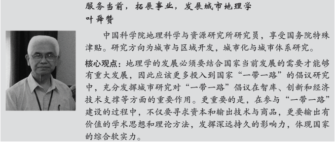 未来中国城市地理研究需要结合国家发展战略。对于当今繁荣的城市地理学,我还有一些看法,就是“我们地理学必须要结合国家当前发展的需要才能够有重要的发展”。过去,为了推动城镇化,我们的城镇规划、区域发展研究进行得轰轰烈烈,取得了丰硕成果。在当前这个阶段,具体来说,我们需要开展“一带一路”发展的战略研究。从目前来看,中国的地理工作者对于中国当前发展重大战略的注意力不够。