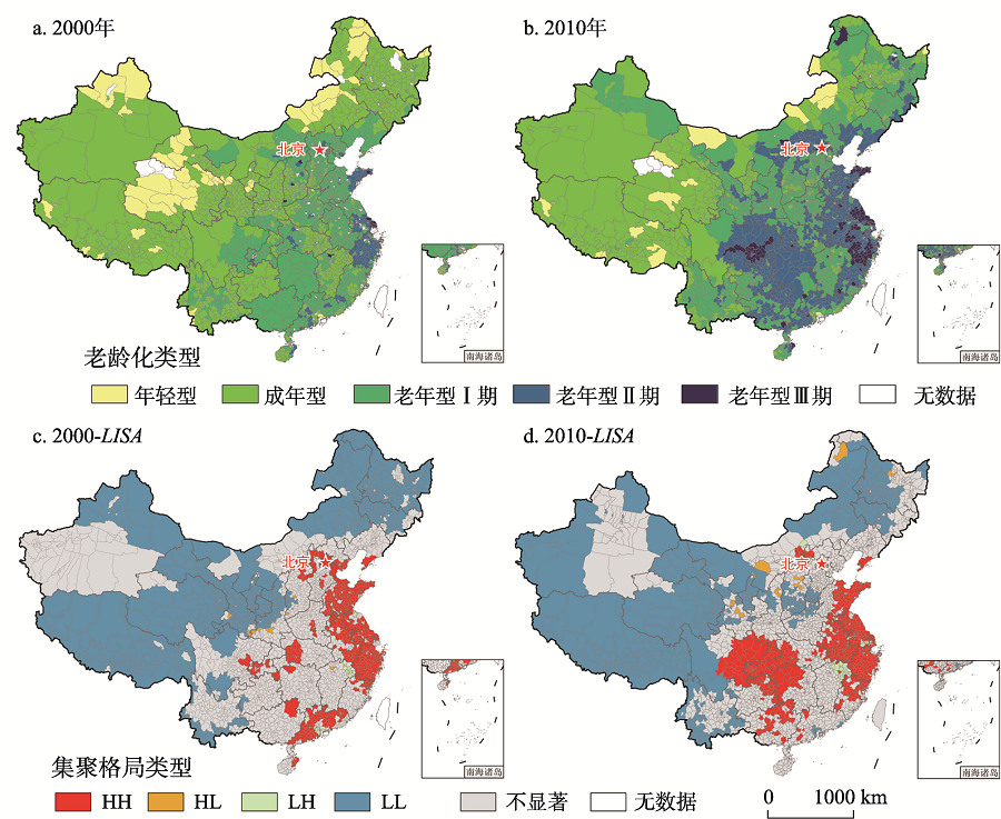 Fig. 2 Spatial distribution profiles of rural population aging in 2000 and 2010图2 2000年和2010年中国农村人口老龄化空间分布 注:此图根据国家测绘地理信息局标准地图(审图号:GS(2016)1569号)绘制而成,底图无修改。 |