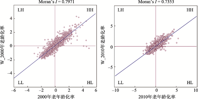 Fig. 3 Global autocorrelation of rural population aging in 2000 and 2010图3 2000年和2010年中国农村人口老龄化全局自相关分布 |