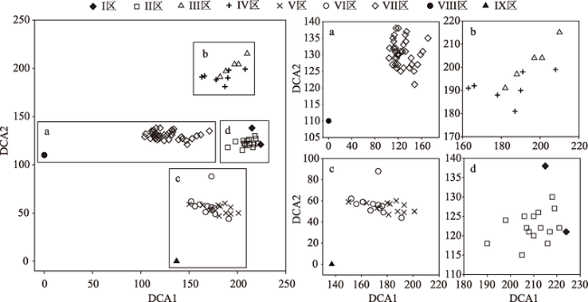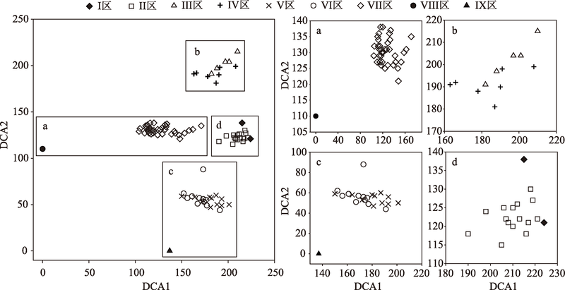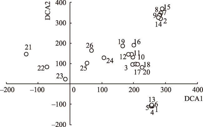 Fig. 3 The DCA ordination diagram of 136 samples图3 136个样地的DCA排序 |