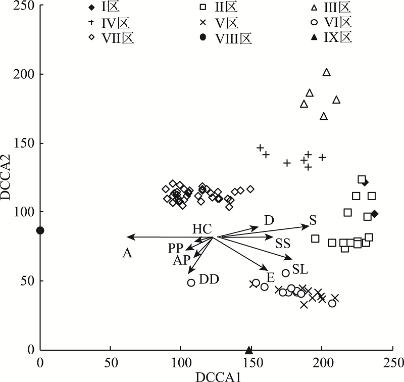 Fig. 4 DCA ordination diagram of main indices图4 主要指标的DCA排序 |