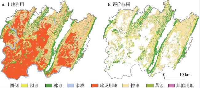 Fig. 2 Land use status and scope of ecological suitability evaluation of development and construction for gentle hillside in Liangjiang New Area图2 两江新区低丘缓坡的土地利用现状和开发建设生态适宜性评价范围 |