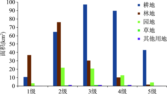 Fig. 7 Comparison of land use area of ecological suitability evaluation grade图7 各生态适宜度评价等级的土地利用面积对比 |