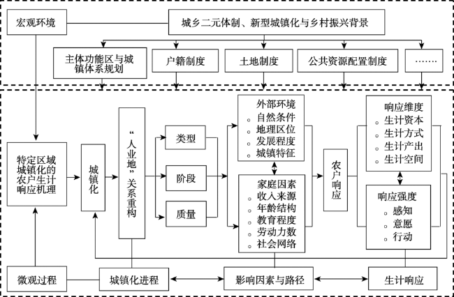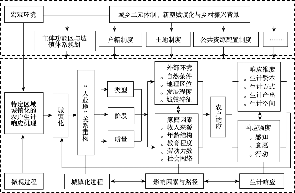基于3个典型乡镇355户农户的调查数据考察武陵山片区农户的城镇化生计响应发现:① 农户生计响应是“城乡连续体”的“人业地”关系重构中乡村聚落的决策单元对城镇聚落吸附与扩散效应的综合反应,受宏观环境、外部条件和家庭因素的影响;② 区域性中心城市郊区、革命老区红色旅游景区和县城近郊特色农业种植区周边农户的生计综合响应、生计空间响应和生计产出响应依次递减,但生计资本和生计方式响应及各维度的响应强度排序不一致;③ 城乡二元体制的演变与新型城镇化战略、乡村振兴战略动态地规制与诱导农户,使其生计响应与国家阶段性战略目标相适应。地形平缓、距离县城较近、经济发展水平较高以及区域性中心城市郊区休闲驱动型城镇化对应于更广维度和更高强度的农户生计响应。收入来源以经商、务工为主,家庭成员中有小孩或老人,有较高教育程度家庭成员以及社会资本较高的农户,其生计响应的维度更广且强度更高。