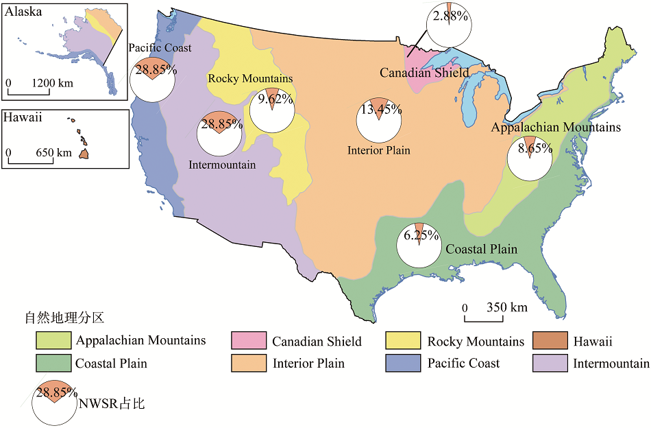 图4 基于自然地理分区的NWSR空间分布注:此图根据USGS官网(Physical Regions of the United States)绘制而成,底图无修改。 Fig. 4 The distribution of NWSR in different regions of the USA |