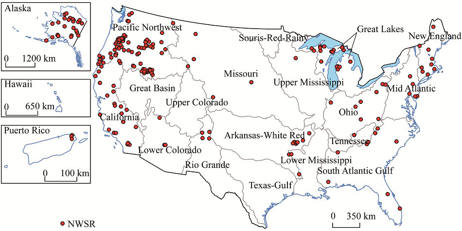图5 基于不同流域的NWSR空间分布注:此图根据USGS官网绘制而成,底图无修改。 Fig. 5 Spatial distribution of NWSR in different watersheds of the USA |