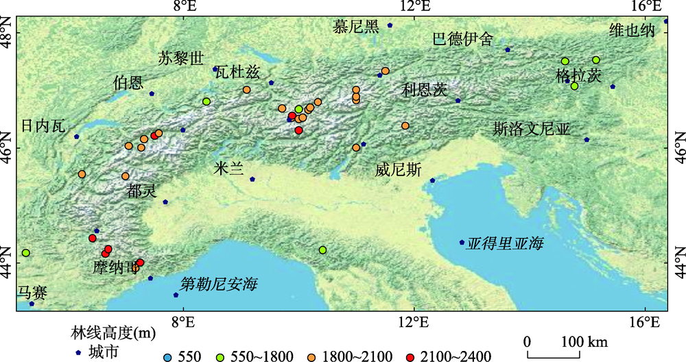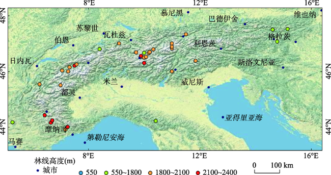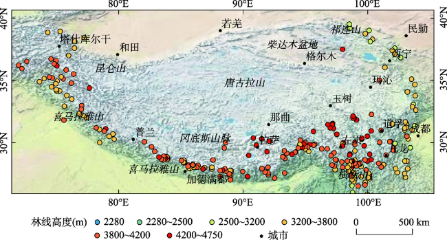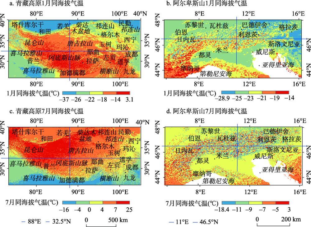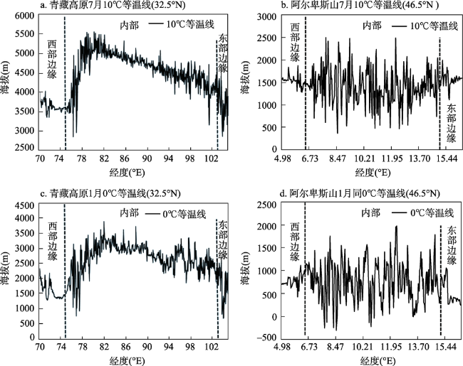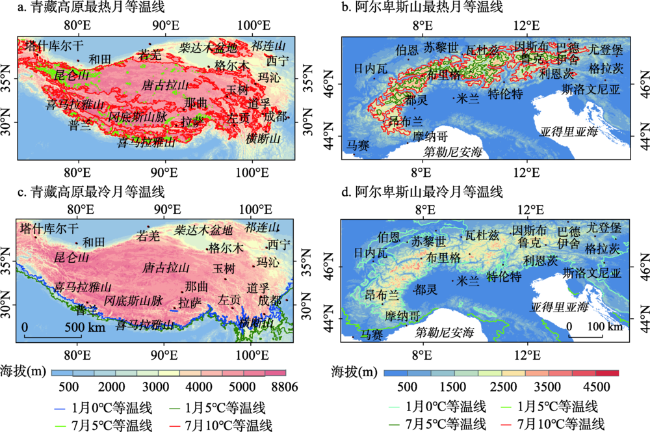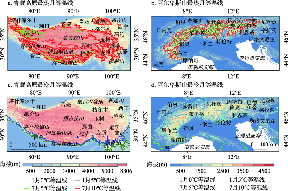 表1 青藏高原与阿尔卑斯山最热月和最冷月等温线分布高度及林线高度对比Tab. 1 Isotherms of the warmest and coldest months and the heights of tree line in the Tibetan Plateau and the Alps |