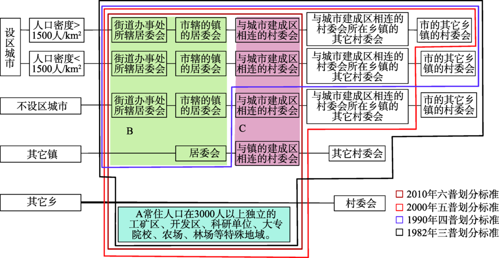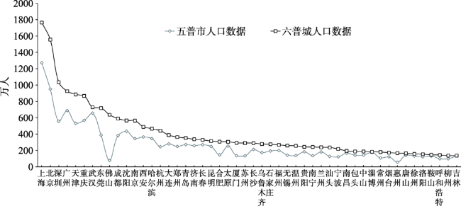 表1 五普“市人口”与相关城镇人口统计口径比较Tab. 1 The comparison between "Shirenkou" and related urban population statistical standards (万人) |