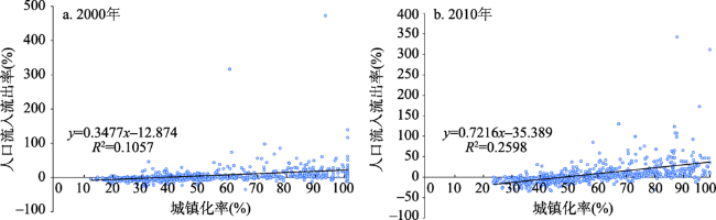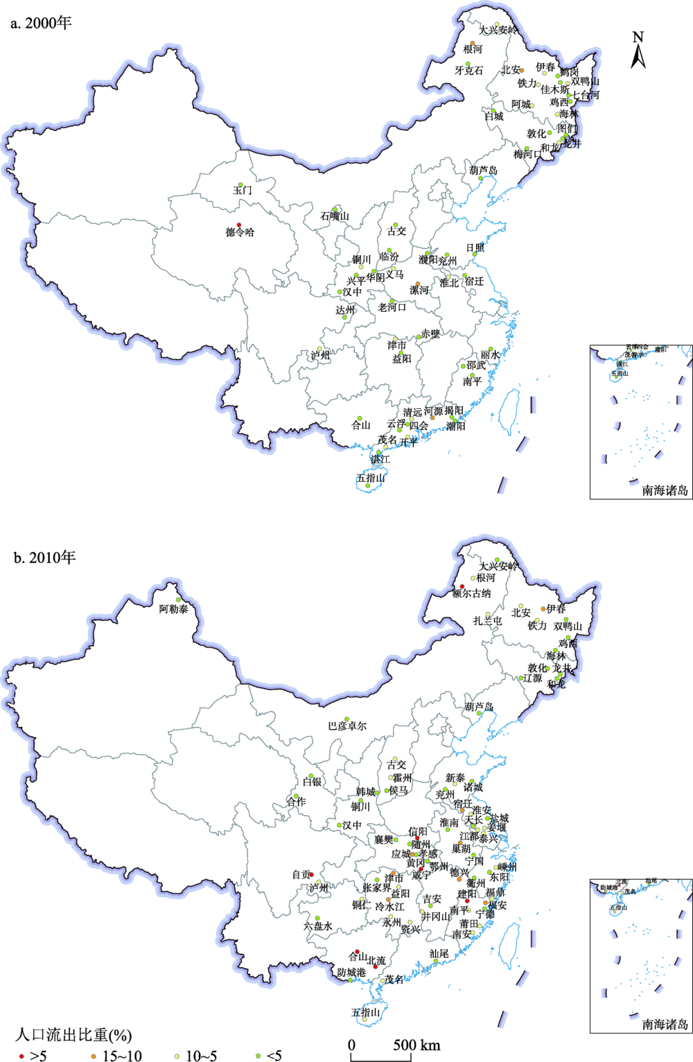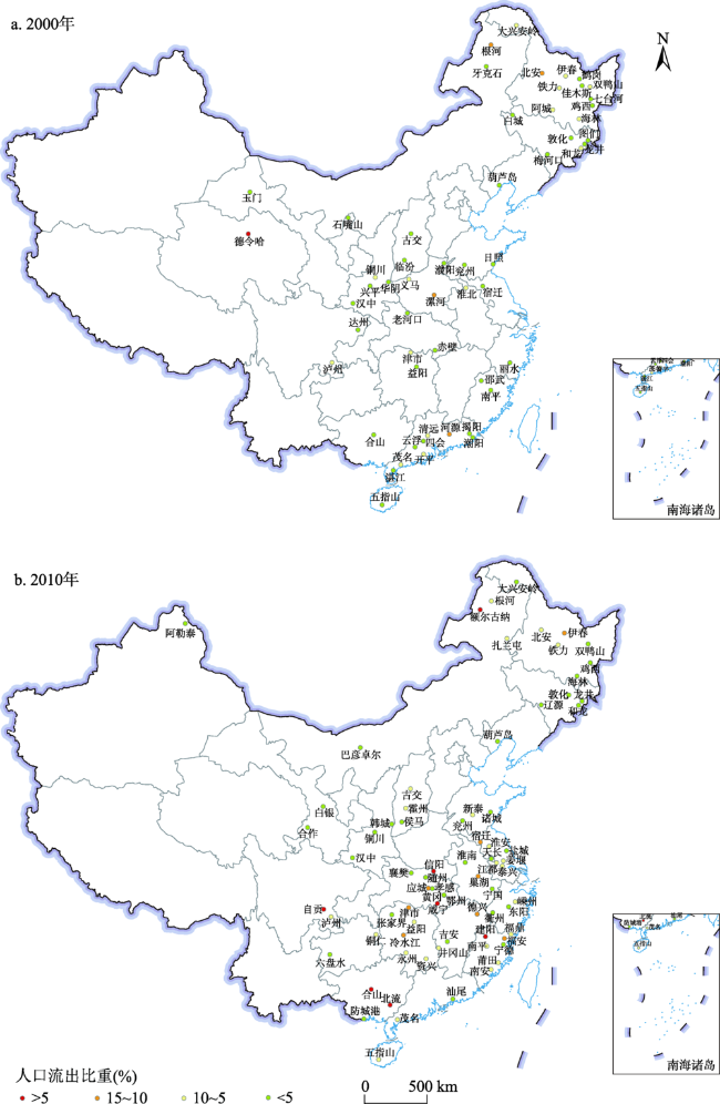 表4 2000年、2010年建制市的户籍人口与常住人口比较Tab. 4 The comparison on the registered population and residential population for designated cities in 2000 and 2010 |