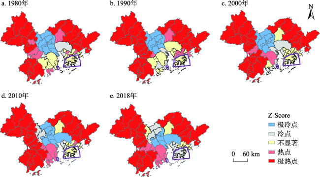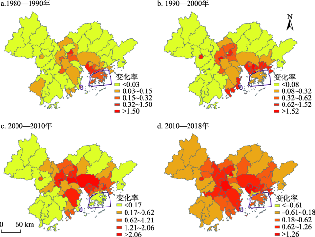 表3 1980—2018年粤港澳大湾区国土空间结构和指数变化Tab. 3 Changes of territorial space structure and index in Guangdong-Hong Kong-Macao Greater Bay Area from 1980 to 2018 |