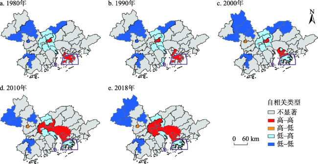 表4 粤港澳大湾区第一空间比重局部空间自相关特征Tab. 4 Analysis of local spatial autocorrelation of the proportion of the first space in Guangdong-Hong Kong-Macao Greater Bay Area |