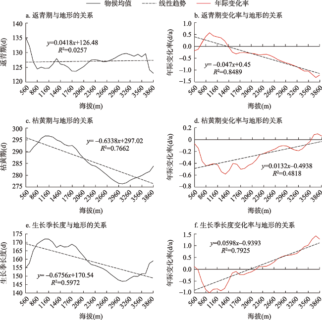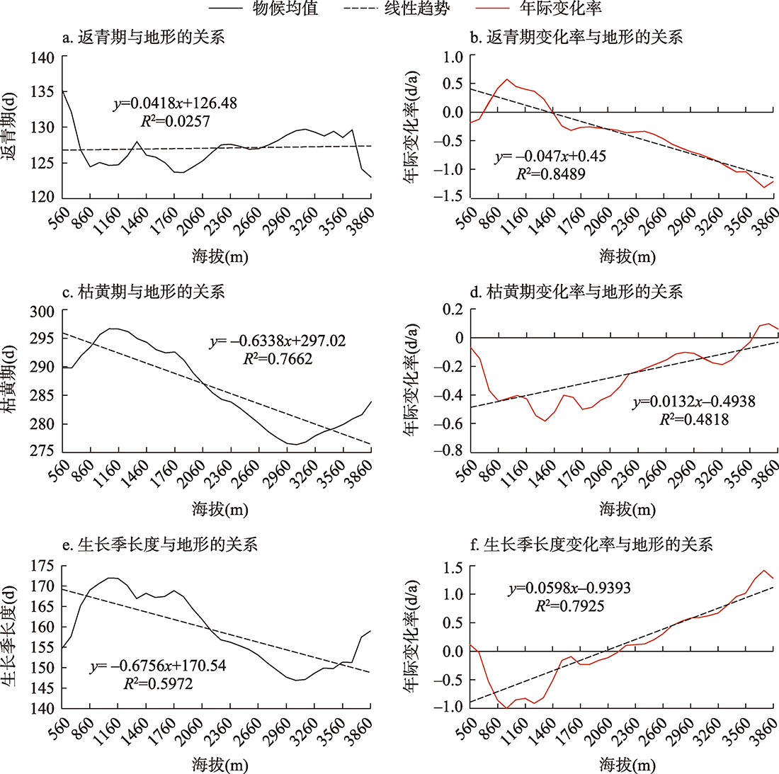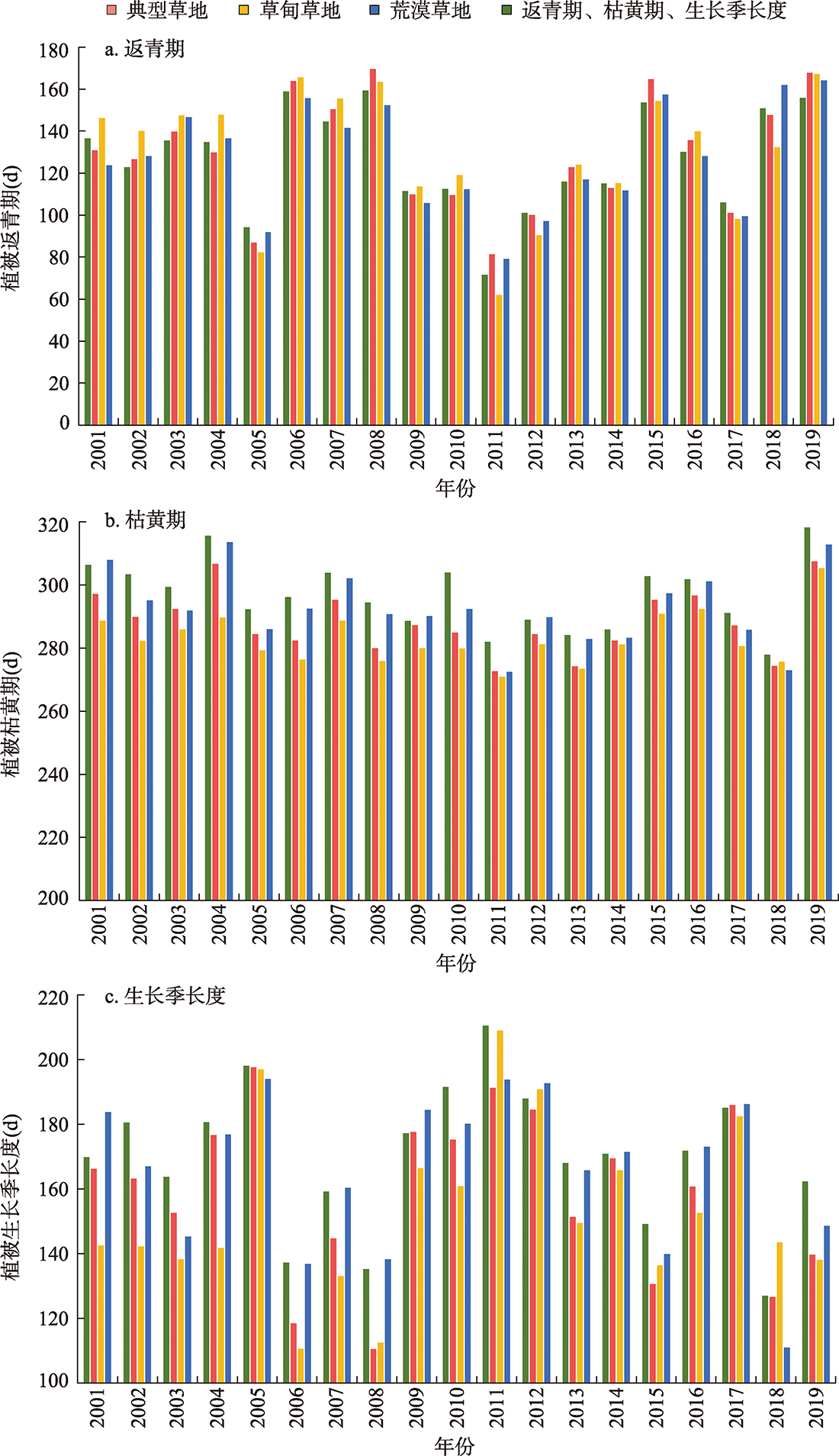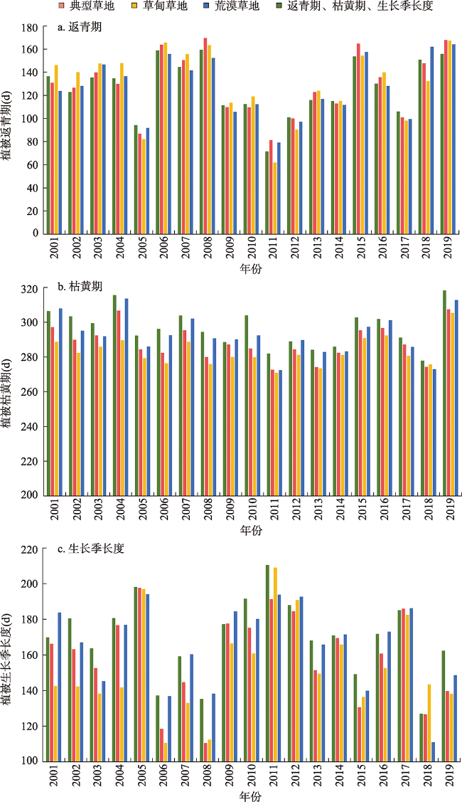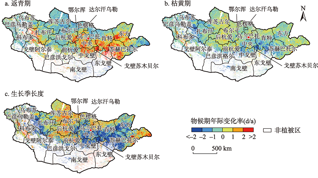 蒙古高原是中国重要的北方生态屏障。在全球气候变化的背景下,研究蒙古国植被物候变化特征对于认识蒙古国草地生态系统对气候变化的响应和促进区域畜牧业可持续发展具有重要意义。本研究利用非对称高斯拟合法对蒙古国2001—2019年MOD13Q1产品中的归一化植被指数(Normalized Differential Vegetation Index,NDVI)数据拟合,得到较为平滑的NDVI时间序列数据;基于TIMESAT平台,采用动态阈值法分析获得蒙古国连续19a植被物候数据。研究分析了蒙古国植被物候的空间分布及年际变化趋势,发现蒙古国植被返青期(Start of growing season,SOS)主要集中在110~150d,总体呈微弱推迟趋势,植被枯黄期(End of growing season,EOS)主要集中在270~310d,总体呈提前趋势,从而导致蒙古国生长季长度(Length of growing season,LOS)呈缩短趋势,且缩短时间最长可达2d以上。采用偏相关分析方法分析了植被物候对地形、降水、地表温度等地理要素的响应,表明蒙古国植被物候具有明显的空间异质性和海拔依赖性,不同植被物候对降水、地表温度(Land Surface Temperature,LST)的响应不同,SOS与日间LST呈显著正相关,EOS与夜间LST呈显著正相关,而LOS与年均降水呈显著负相关关系。