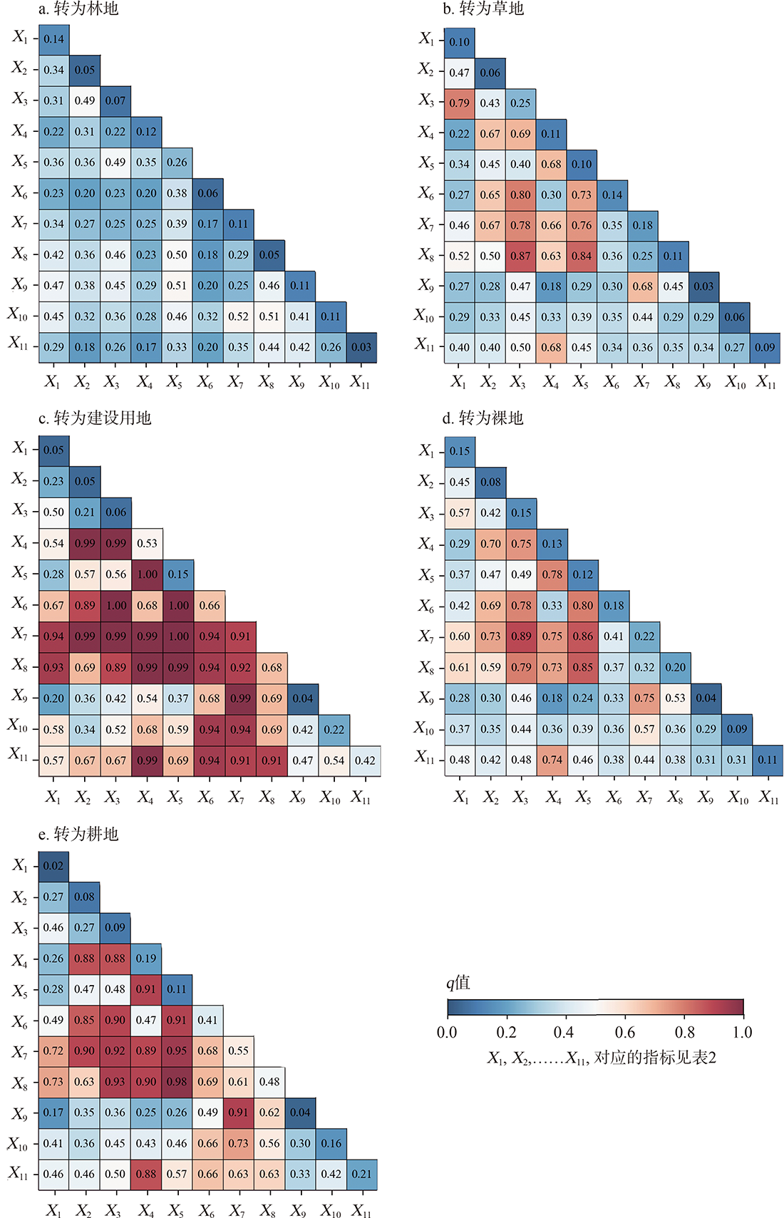| 驱动因子 | 转为林地( ) | 转为草地( ) | 转为建设用地( ) | 转为裸地( ) | 转为耕地( ) |