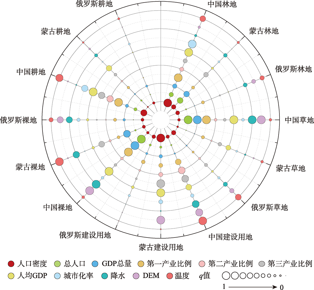 表2 2010—2018年中蒙俄经济走廊土地利用变化驱动因子解释力Tab. 2 Explanation of driving factors of land use change in the China-Mongolia-Russia economic corridor from 2010 to 2018 |