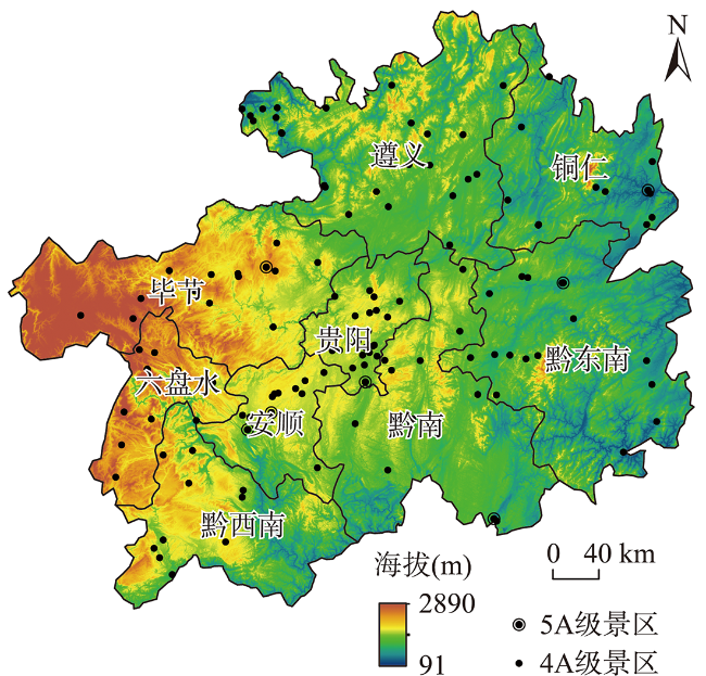 旅游资源禀赋 | 5A、4A景区加权分 | 避暑旅游者趋向高等级旅游景区流动。据贵州省文旅厅数据,按照图2(b)中5A、4A景区平均到访量赋值为83.32、16.68,求加权值后建立差值矩阵 | + | [37,38] |