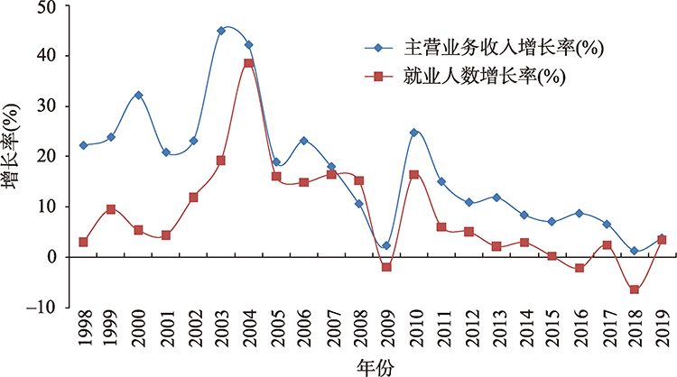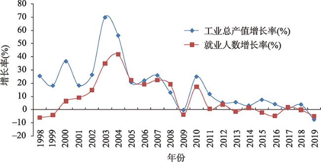 图1 1998—2019年全国电子信息产业主要经济指标的增长率变动Fig. 1 Changes in growth rate of main economic indicators of China's electronic information industry from 1998 to 2019 |