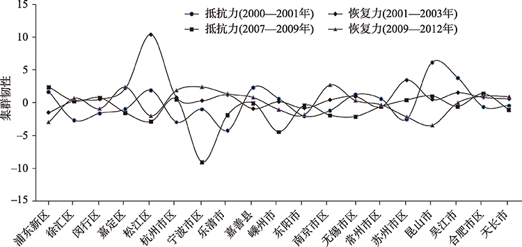 | 外生型集群 | 浦东新区、徐汇区、闵行区、嘉定区、松江区、南京市区、无锡市区、常州市区、苏州市区、昆山市、吴江市 | 低抵抗力-高恢复力(8) | 低抵抗力-高恢复力型; 高抵抗力-低恢复力型 |