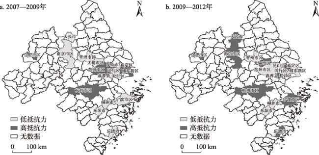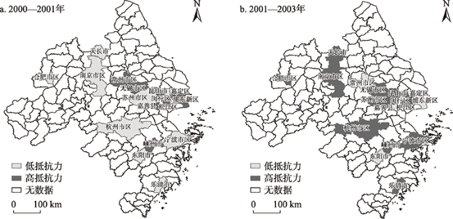 | 内生型集群 | 杭州市区、宁波市区、乐清市、嘉善县、嵊州市、东阳市、合肥市区、天长市 | 低抵抗力-高恢复力(9) | 低抵抗力-高恢复力型 |