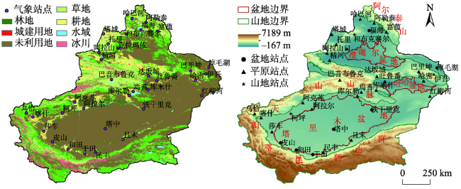 全疆 | 位于林地、草地、耕地、水域、城建用地、未利用地、冰川等下垫面的气象站点 分别有3个、3个、10个、2个、12个、4个、0个,总计34个气象站点 |