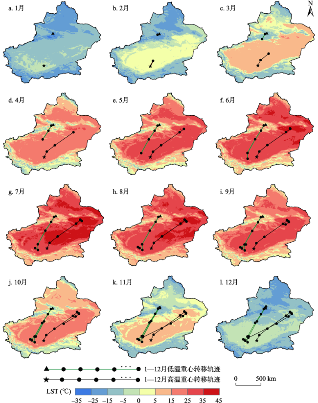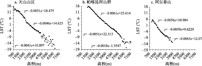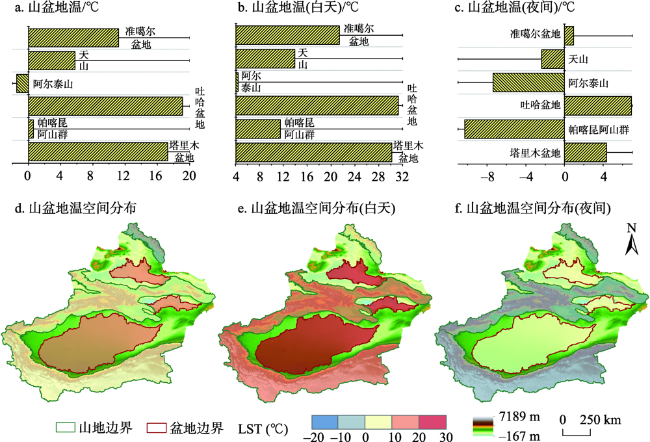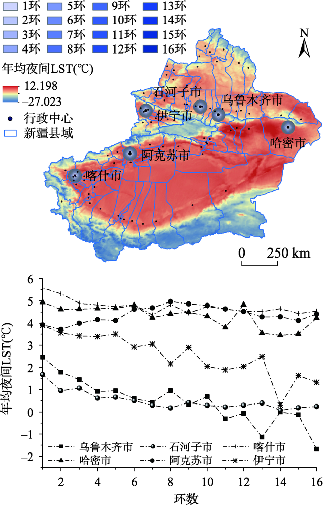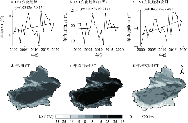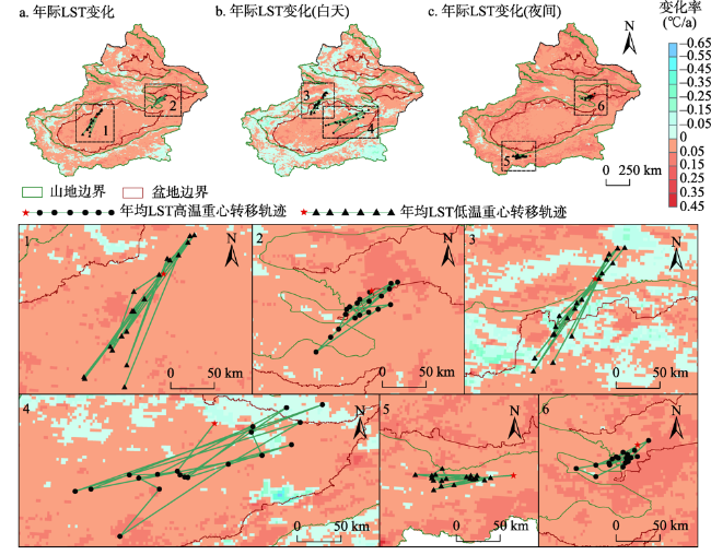 地表温度(LST)作为陆地环境相互作用过程研究中的重要地学参量,其时空分异与下垫面属性、地形地貌格局等息息相关。本文基于2000—2020年MOD11C3数据,采用GIS空间分析、空间重心模型及改进的半径法等手段,对新疆地区月、季、年及昼夜等序列时空尺度LST的分布特征及变化趋势进行研究,并借助LUCC、DEM等多源遥感数据进一步探讨各类下垫面、不同地貌单元及部分典型区域的LST垂直递减率、增减温及热(冷)岛效应等地理特征。结果表明:① 研究期间新疆年均LST为9.45 ℃,呈减温和增温趋势的区域分别占研究区面积的13.3%和86.7%,增温区域占绝大部分,故近20年研究区整体呈升温趋势(0.024 ℃·a-1),较全国高出约0.01 ℃·a-1,其中春季增幅最大,冬季次之;夜间LST变化明显强于白天,春、夏两季昼夜温差均大于23.7 ℃,而冬季最小(约15 ℃);研究区年际高、低温重心迁移轨迹大多分布于LST变幅较大区域,各月LST空间分布及高低温重心转移轨迹均表现出以7月为中点的年内强对称性规律。② 不同下垫面地表冷热环境空间分布差异较显著。其中以荒漠和裸土为主的未利用地年均LST最高(13.42 ℃)且昼夜温差最大(23.6 ℃),高寒区冰川年均LST最低(-7 ℃)且昼夜温差(14.3 ℃)最小,其他下垫面年均LST在2.6~11 ℃之间,昼夜温差较小且较一致(平均16.75 ℃)。③ 东西走向的“三山夹两盆”地貌结构,使新疆LST的纬度地带规律被大幅削弱。研究区各山区(群)LST垂直递减率不尽相同,地处较高纬的阿尔泰山递变(0.63 ℃/100 m)最明显,山体高大的帕喀昆阿山群递变(0.57 ℃/100 m)次之,天山山脉递变(0.54 ℃/100 m)最小。另外各山区(群)山麓处均出现了不同程度的逆温现象,而山腰处LST垂直递减率线性拟合效果最佳。④ 本研究所选取的部分典型城市大都表现出不同程度的热岛效应。其中乌鲁木齐市热岛效应最为强烈,伊宁市其次,哈密市最微弱,而阿克苏市则表现出绿洲城市冷岛效应,但各城市热(冷)岛效应均存在一定环数(8环)范围的冷、热岛足迹。