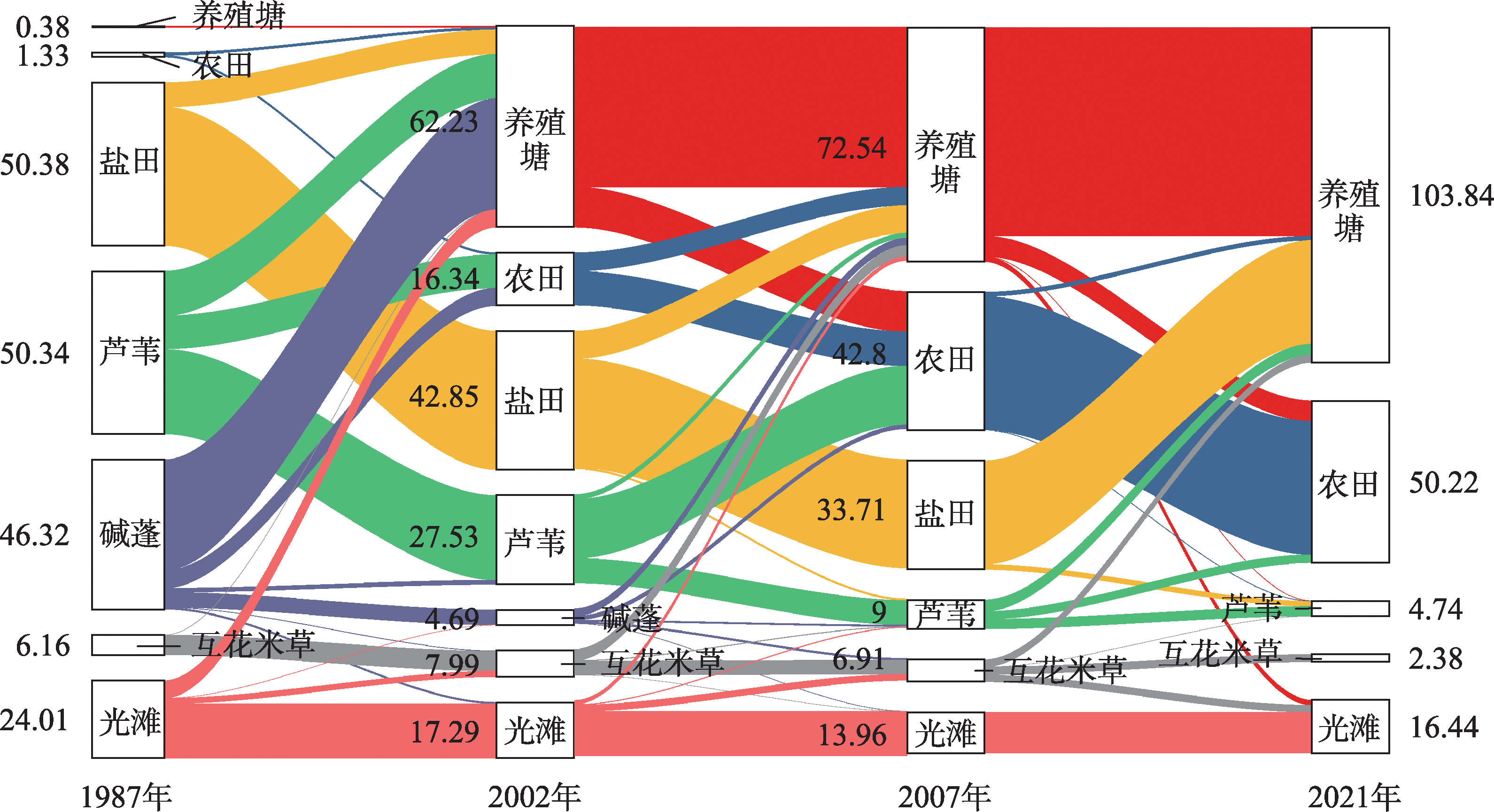 | 咸水养殖 | Ⅶ 碱蓬/光滩→咸水养殖 | 1998—2021年(23) | 1.1 | 0.1 |