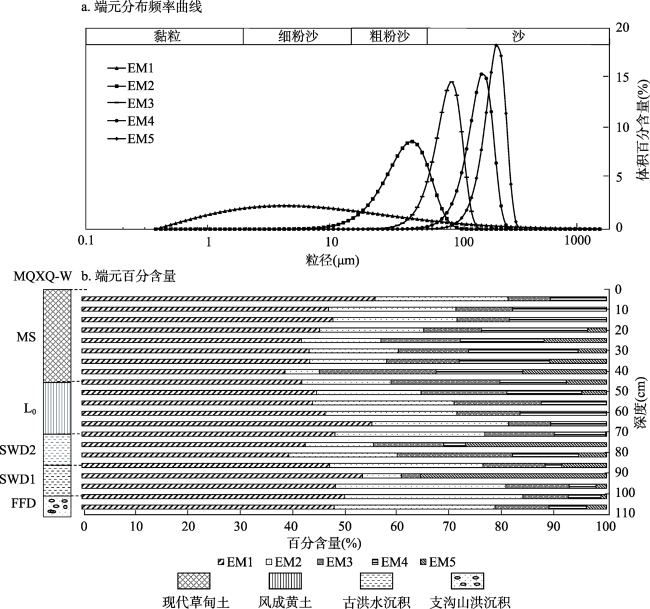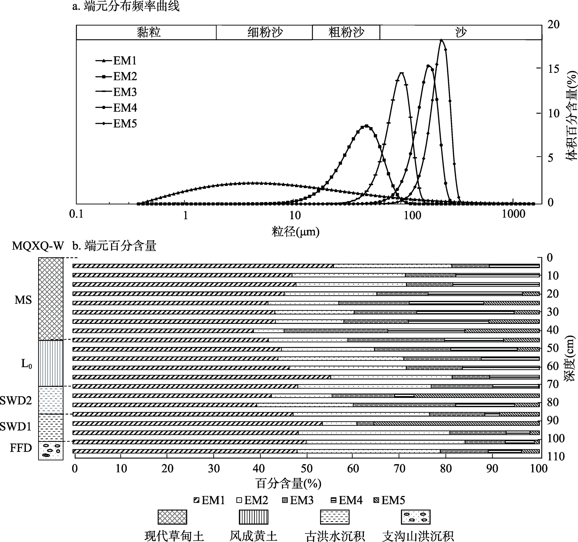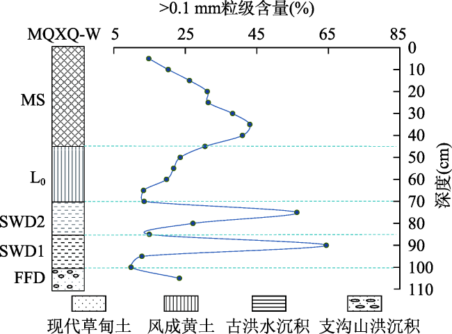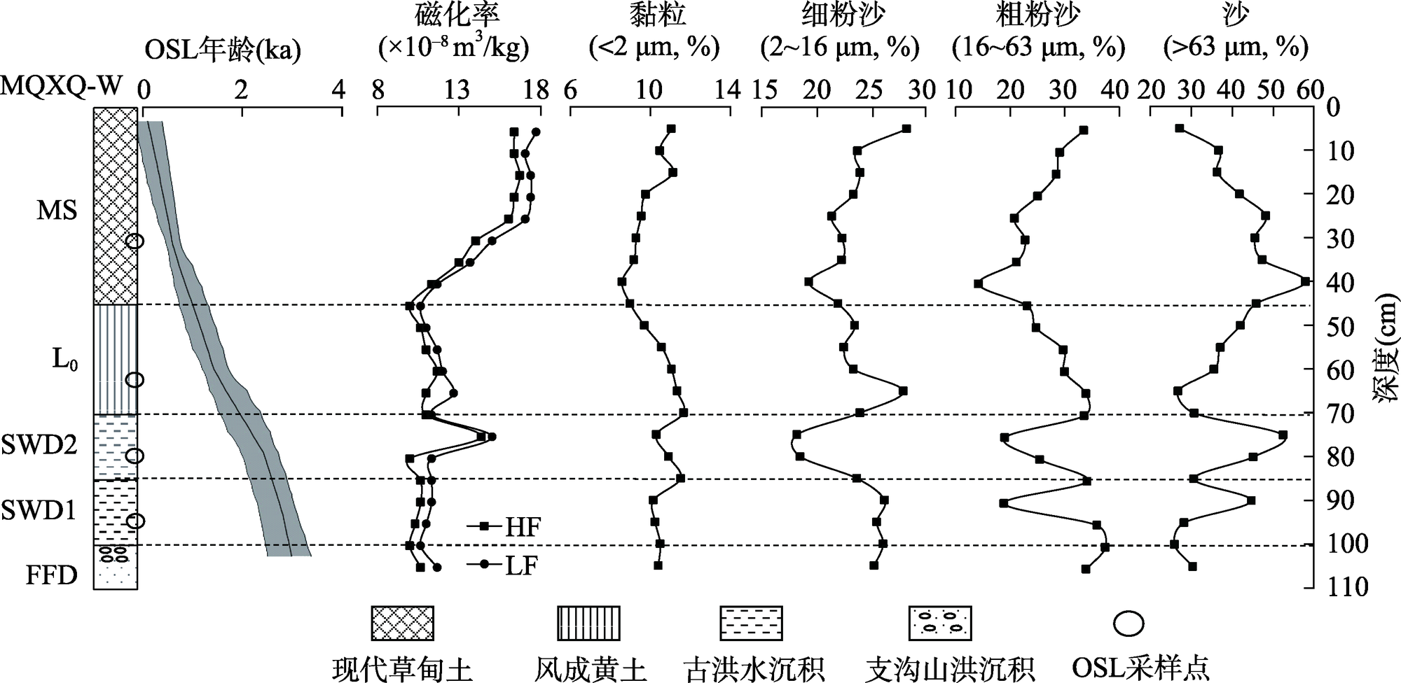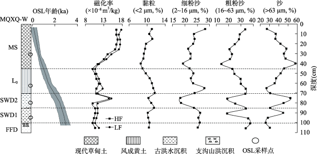 表3 黄河玛曲段MQXQ-W剖面地层沉积物粒度参数Tab. 3 Grain-size parameters of the MQXQ-W profile in the Maqu reaches of the Yellow River |