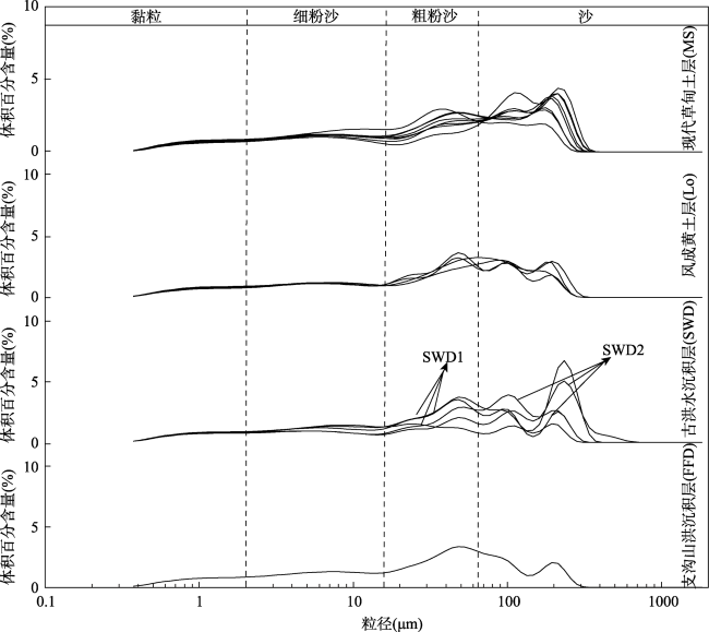 古洪水沉积层(SWD) | 70~100 | 浊黄橙色(2.5YR6/4),界线清晰,水平层理发育,可分辨出两次古洪水沉积层(SWD1、SWD2),单层厚度约15 cm,内部呈现细-粗-细粒序层理,沉积物粒度组成以粉沙和细沙为主,结构均一,块状构造。 |