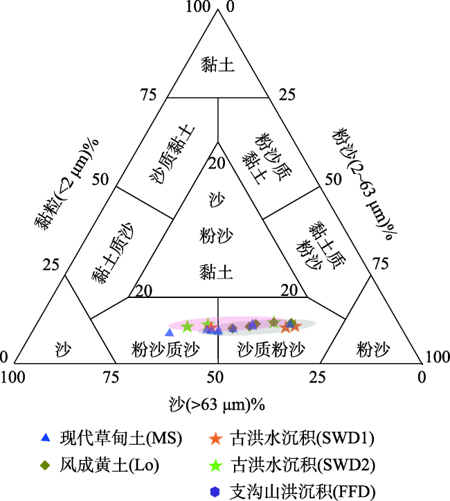图5 黄河玛曲段MQXQ-W剖面沉积物粒度谢帕德三角分类图Fig. 5 Shepard's triangle classifications of sediments from the MQXQ-W profile in the Maqu reaches of the Yellow River |