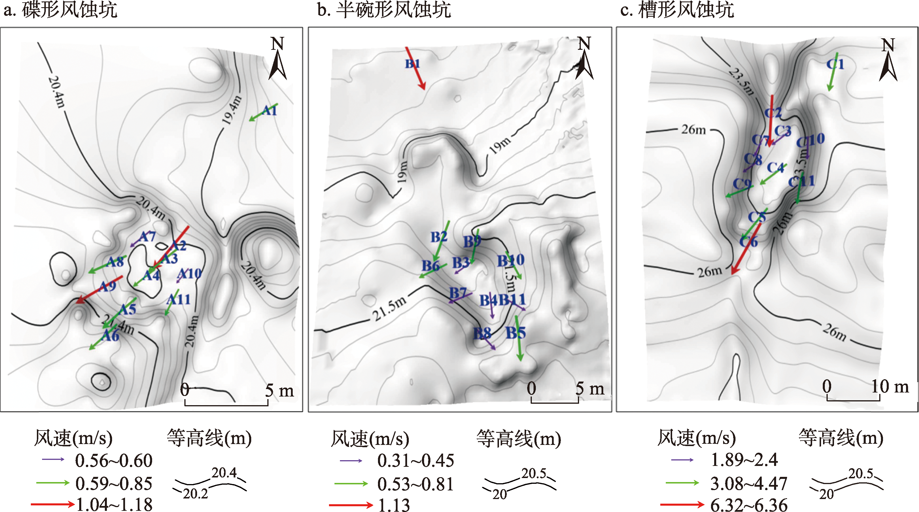 | 风蚀坑 | 面积 (m2) | 长轴走向 (°) | 长轴长 (m) | 宽度 (m) | 深度 (m) |
