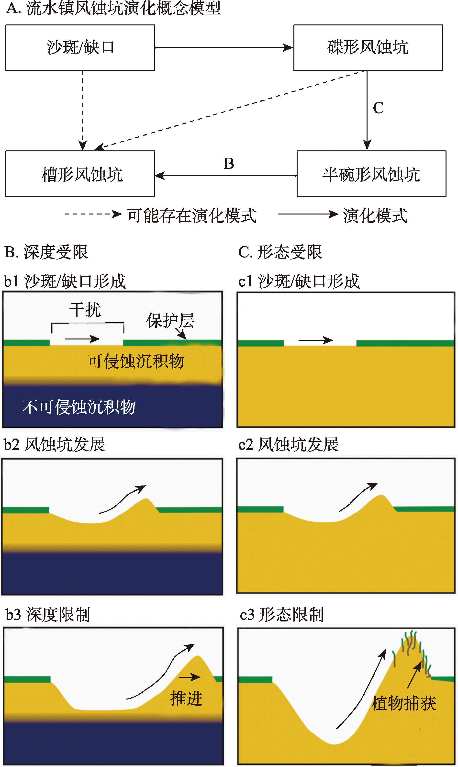 风蚀坑作为一种沙地负地貌形态一直是风沙地貌学关注的焦点,对风蚀坑的研究有利于更好理解其形成演化及其动力机制。选择海岸风蚀坑发育具有典型代表性的海坛岛沿岸沙丘区,以碟形、半碗形、槽形风蚀坑为研究对象,利用RTK GPS技术及二维超声风速仪对风蚀坑形态重复测量与气流观测,采用“空代时”方法探讨了风蚀坑演化模式及其形态与气流反馈机制。结果表明:① 碟形风蚀坑形态沿盛行风向向侵蚀盆后部扩大加深并形成陡坎,入口则沿盛行风向呈后退趋势;半碗形风蚀坑形态沿盛行风向扩展并突入侵蚀壁形成破口,不断扩大加深;槽形风蚀坑侵蚀盆沿盛行风向向积沙区扩展且东侧壁形成分叉并逐渐向后部延伸。② 来流风向与风蚀坑形态影响坑体内气流场分布,而坑体内部不同部位流速差异则促使不同部位发生侵蚀或堆积。③ 风蚀坑演化模式为沙斑或缺口的产生→碟形风蚀坑→半碗形风蚀坑→槽形风蚀坑扩大并消亡四个阶段,地表植被在整个演化过程中起关键作用。其中,受形态与深度限制促使半碗形风蚀坑向槽形风蚀坑转变,槽形风蚀坑则不断扩大形成分叉逐渐走向消亡。