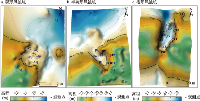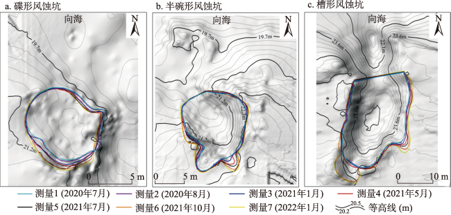 表2 不同时段风蚀坑侵蚀/堆积形态参数Tab. 2 Morphological parameters of blowout erosion/accumulation at different time periods (m) |