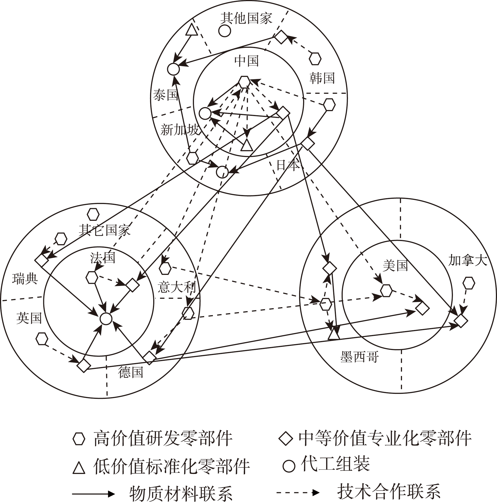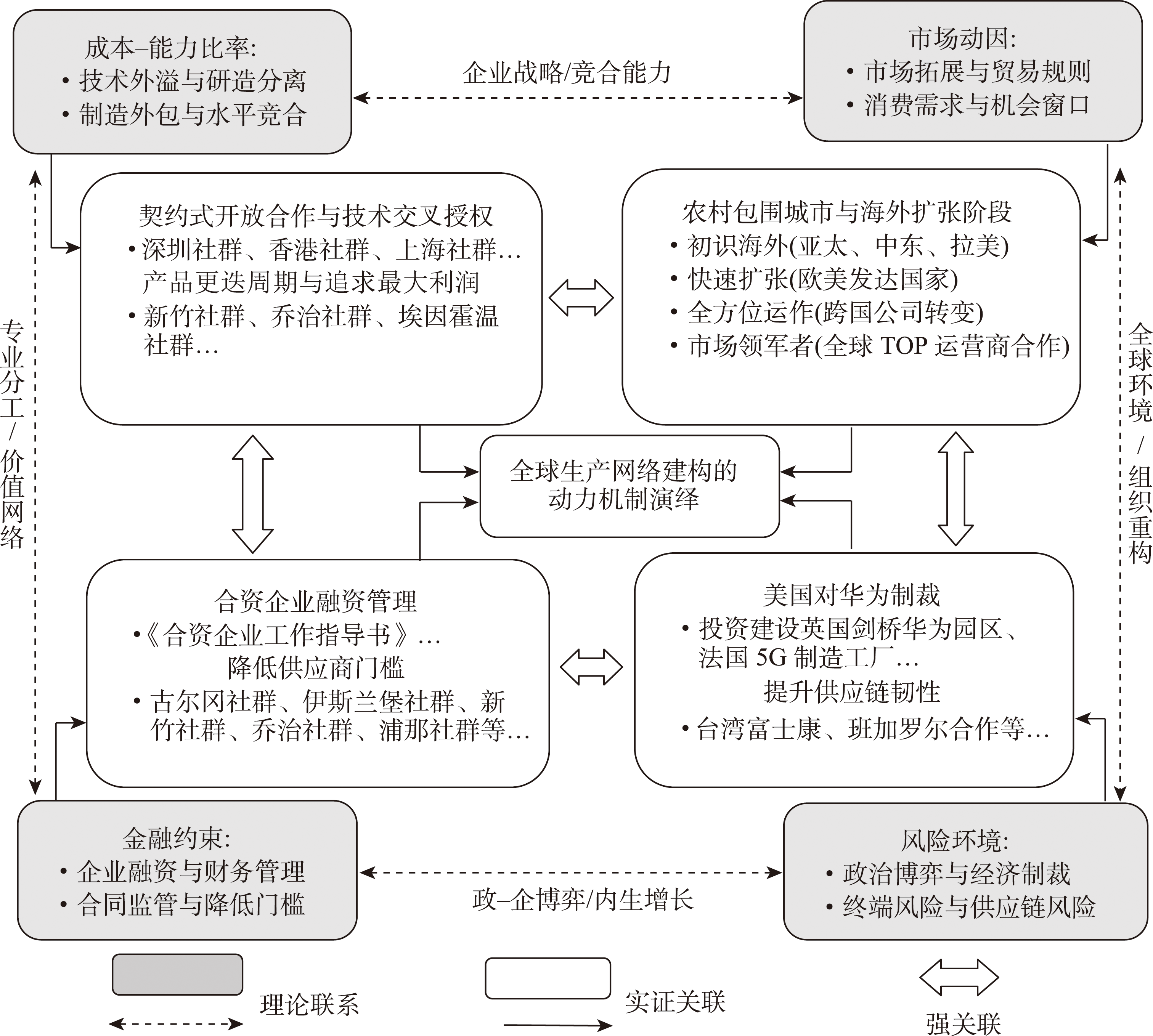 全球生产网络(GPN)作为当前全球经济地理研究的核心议题之一,网络结构与演化过程已被充分讨论,然而如何在经济逆全球化和大国博弈背景下,基于典型案例揭示其网络特征和影响因素等问题仍需探究。本文选取2020年华为手机供应商数据,依据GPN2.0框架下企业行动者角色功能,深入探讨华为手机生产网络特征及影响因素。研究表明:① 就华为手机而言,虽然整体上技术合作和零部件制造呈现典型的全球链接特征,但更值得关注的是,不同角色功能的企业行动者及其产品所处的不同价值链位置,所构建的生产网络呈现出显著的空间差异。② GPN2.0框架下的企业成本-能力比率、市场动因、金融约束以及风险环境等因素虽然对华为手机生产网络空间组织建构发挥了重要作用,但无法完全解释现实经济中其高度复杂的网络等级结构和社群跨域特征,应与国家行动者角色、金融环境、劳工条件等进行交互补充和兼容整合,才能更加系统的解释华为手机生产网络空间组织建构的影响因素。③ 对于后发国家和地区而言,本土企业融入全球生产网络,实现战略耦合与区域发展需要更加契合的理论指导。本研究通过“产品价值-企业区位-城市载体”实现了与GPN侧重企业在组织上和地理上的结构特征分析的一致性,促进了城市关系由场空间向价值空间的转变,以期为GPN理论的中国本土化提供科学实践支持。