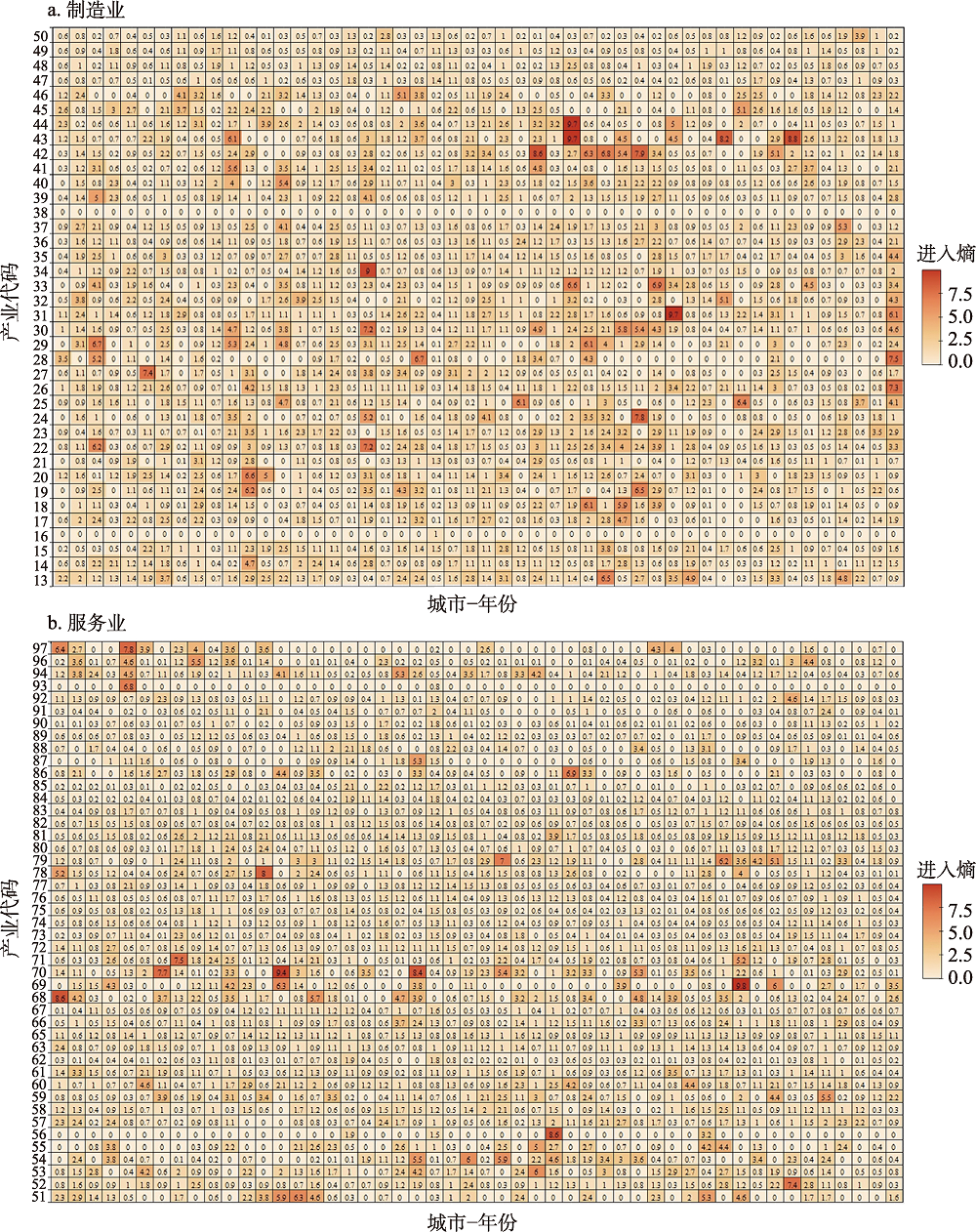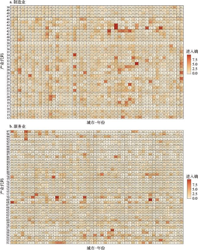 图7 中国制造业、服务业产业碳排放热力进入熵注:所有产业进入数量均参照样本城市高增长年份滞后一期。 Fig.7 The heat map of carbon emissions from manufacturing and service industries |