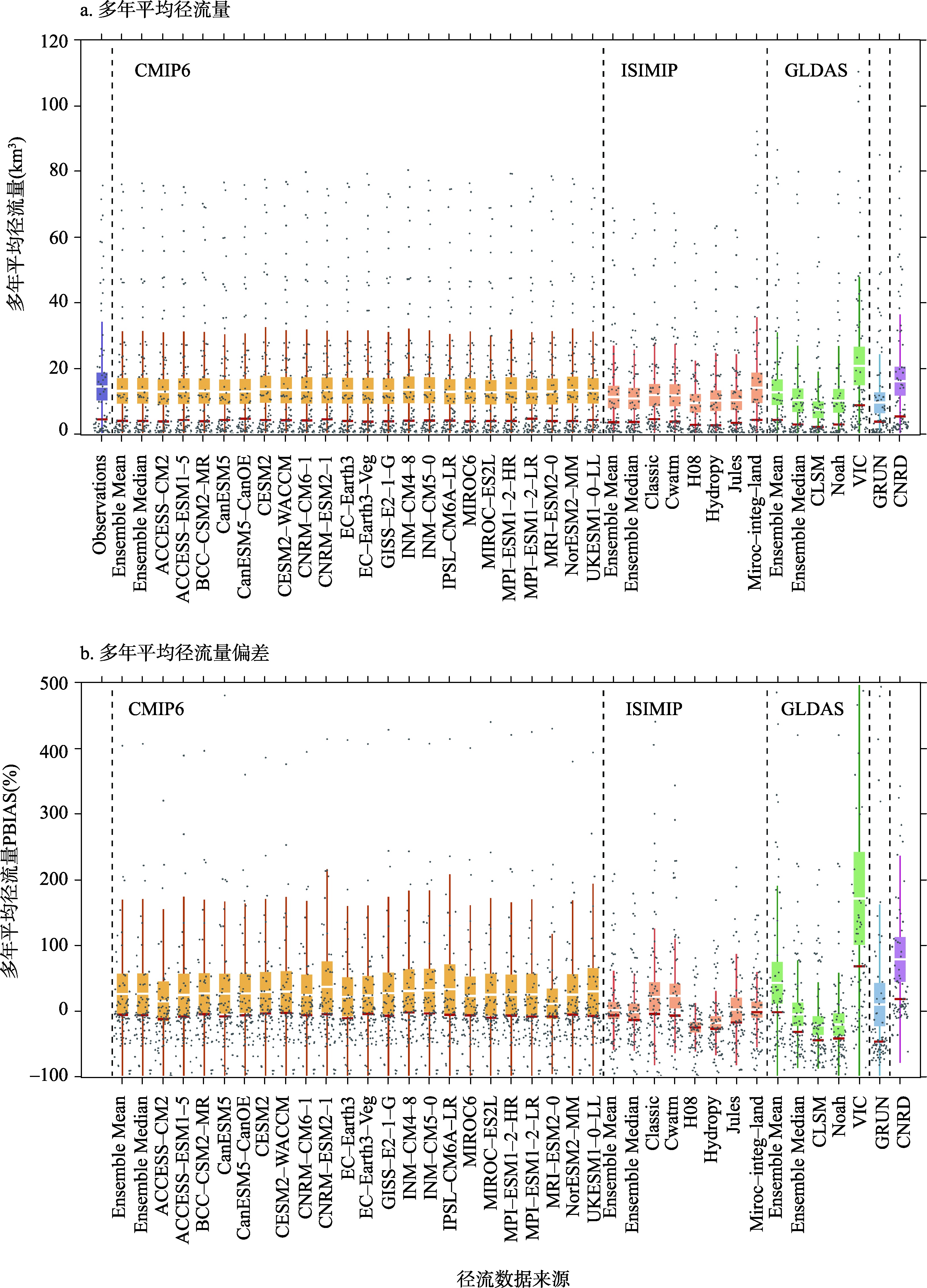 多源径流数据是理解地表水资源分布格局和演变规律的基础,径流数据的比较和筛选是其应用和推广的前提,但中国范围内的径流数据比较研究仍相对缺乏。本研究在中国九大流域片,选取控制范围不重叠、1961—2014年天然径流资料连续的82个水文站,从多年平均径流量和径流变化趋势两个方面,评价了CMIP6地球系统模式、ISIMIP3a全球水文模型、基于陆面模型的GLDAS和CNRD、基于机器学习的GRUN等四类33套径流数据集的质量。研究表明:① 百分比偏差的评价结果显示,经过偏差校正的CMIP6、ISIMIP3a、GLDAS、GRUN、CNRD均能较好模拟大部分流域的平均径流;综合标准差、均方根误差、皮尔逊相关系数3个评价角度的泰勒图分析结果显示,CNRD在松辽河流域,长江、珠江、东南诸河流域,西北、西南诸河流域表现最优,偏差校正后的CMIP6和GLDAS多模型平均结果在黄淮海流域表现最优。② 多源径流数据对多年平均径流量的模拟普遍较好,而对年径流变化趋势的模拟结果较差,特别是CMIP6和GRUN严重低估了径流趋势,约10个流域的趋势模拟结果与天然径流资料的趋势相反。③ 多源径流数据在相对干旱区域模拟结果较差,亟需提高驱动数据质量、改进模型结构、优化模型参数,以提升模型对干旱区水循环过程模拟的精度。这项工作为研究中国河川径流及地表水资源时空演变规律,提供了数据筛选的重要依据,为多源径流数据在中国不同流域的更新与发展,明确了可能的问题和改进方向。