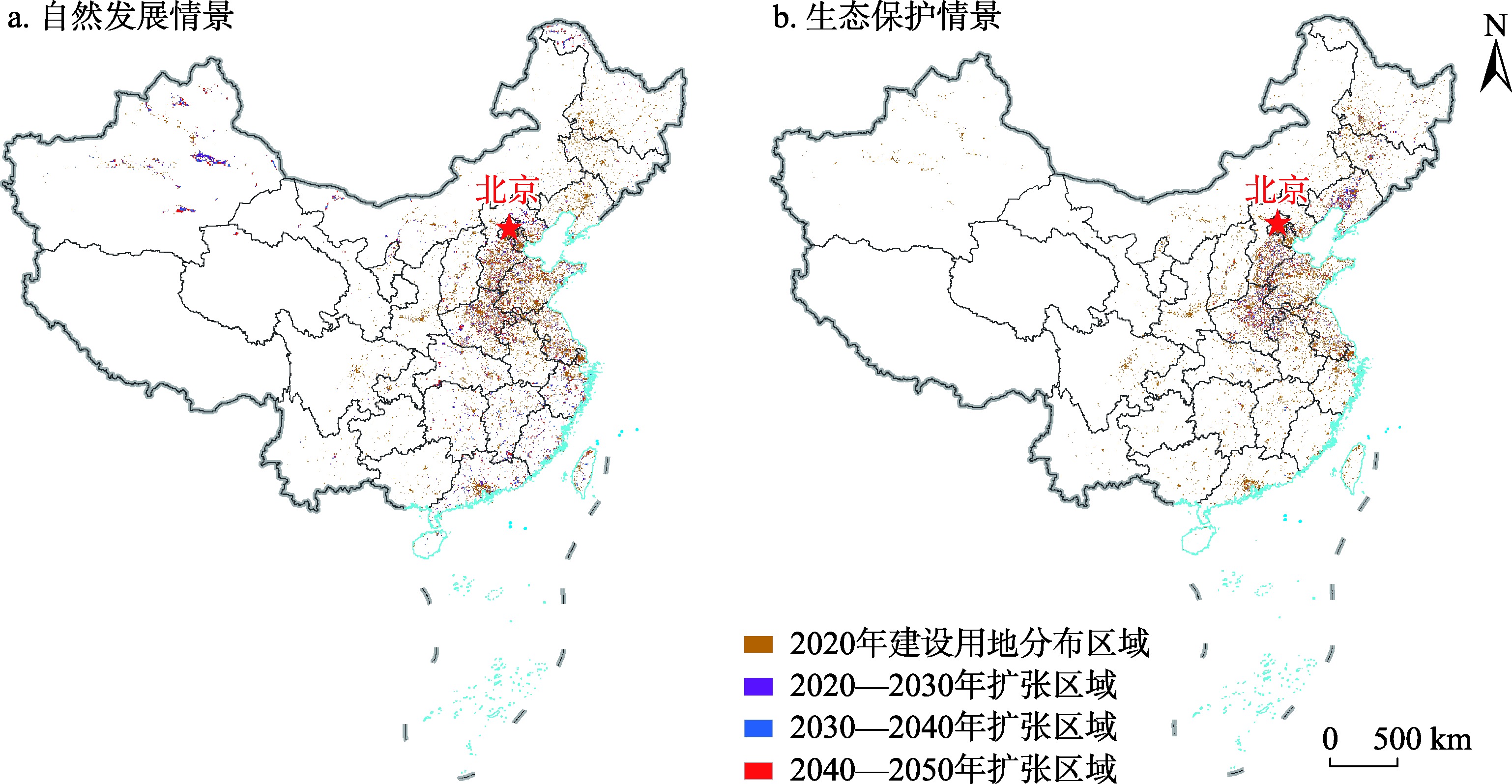 图5 2020—2050年期间自然发展、生态保护情景下建设用地扩张区域分布注: 基于自然资源部地图技术审查中心标准地图服务网站的标准地图(审图号:GS(2020)4619号)绘制,底图边界无修改。 Fig. 5 Distribution of construction land expansion areas under the natural development scenario and the ecological protection scenario during the period 2020-2050 |