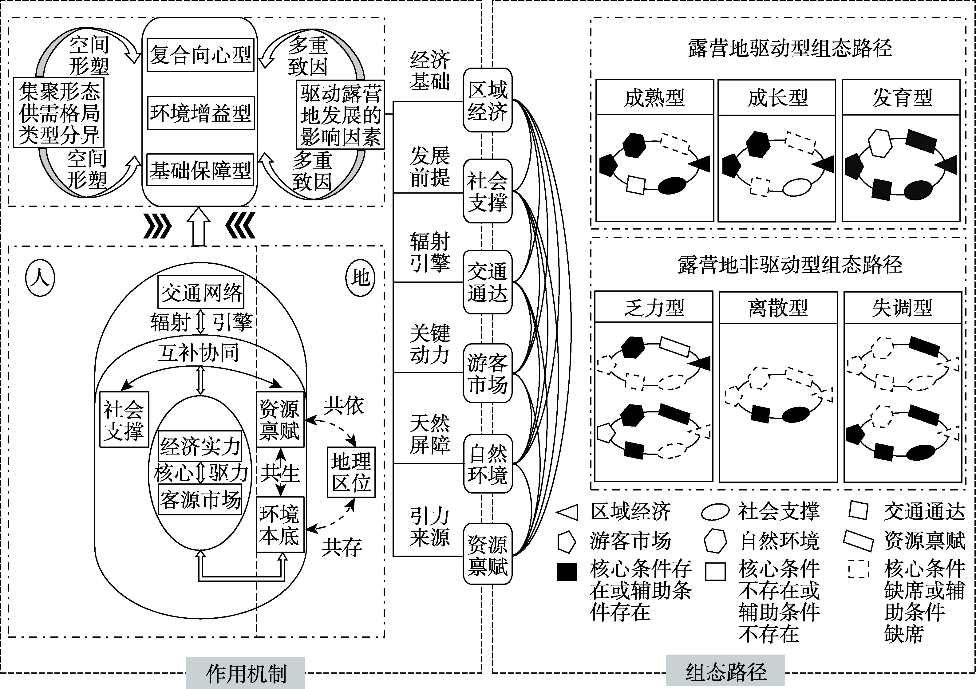 露营旅游热潮带动露营地数量快速增长,研究其空间布局及成因对优化资源配置、丰富露营产品供给具有重要作用。本文在界定露营地概念的基础上,借助Ripley's K函数、核密度估计及空间自相关等方法,刻画山东省露营地空间布局特征,并运用模糊集定性比较分析方法探究露营地布局的组态影响及其作用机制。结果表明:① 山东省露营地空间布局总体呈“双核多中心”结构,以济南、青岛为核心向外围扩散;不同距离尺度,双峰“M”型集聚特征明显,集聚半径近城内和城际90 min可达圈。② 露营地供需耦合协调度较低,失调区呈斑块状组团布局,协调区沿陆海发展轴分布,供需空间不均衡。③ 露营地数量与客源承载量高低分异的类型特征显著;不同类型“单/双核多中心”热点交错集聚、冷点散落的地域分异规律明显。④ 区域经济、社会支撑、交通通达、游客市场、自然环境、资源禀赋6个要素共同作用,产生3种驱动型组态路径和3种非驱动型组态路径;多要素组合作用形成复合向心型、环境增益型和基础保障型三维驱动机制,引致露营地呈“双核一轴多中心、环城近景沿干线”的空间分异格局。